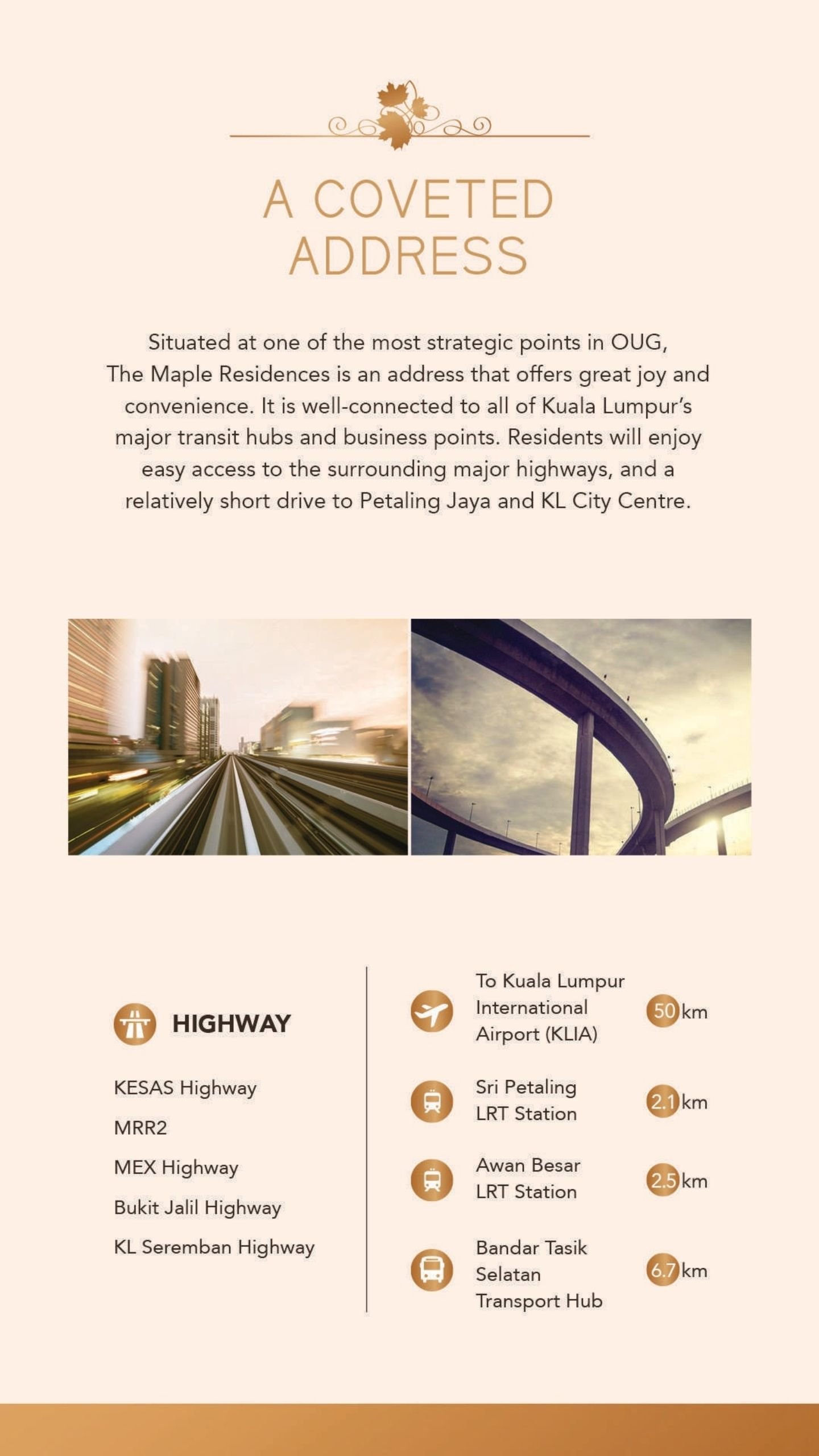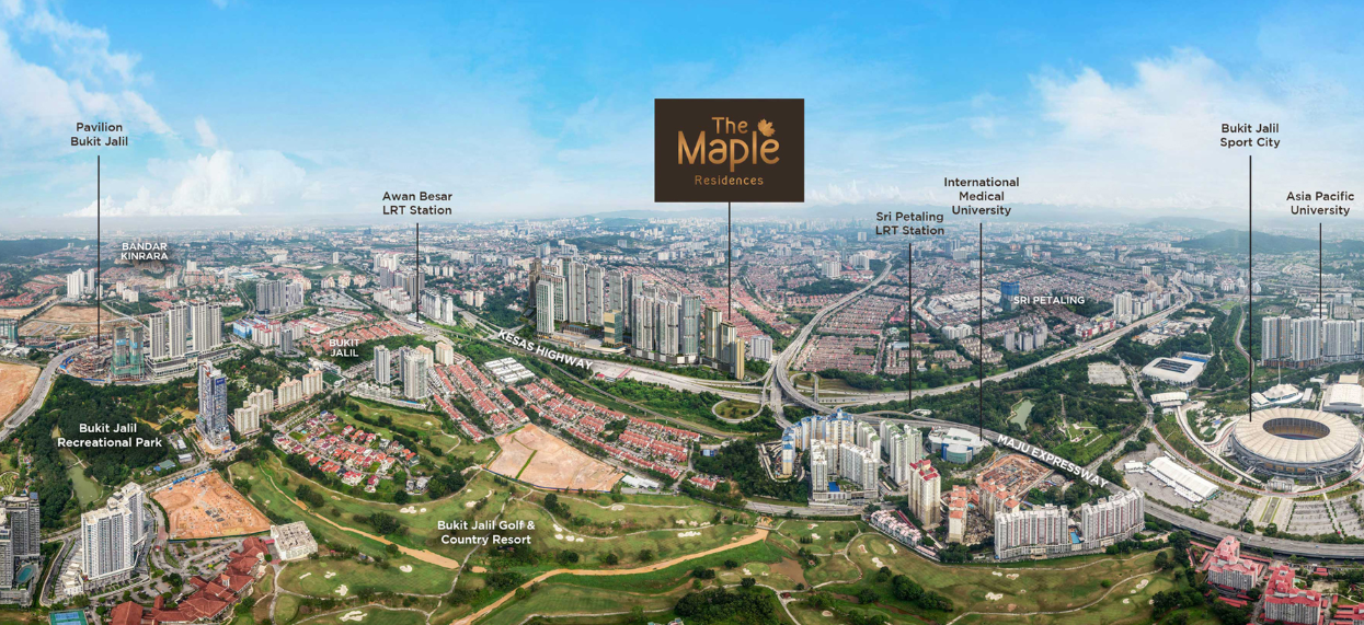 Located on Jalan Awan Besar, The Maple Residences offers seamless access to the KESAS and MEX Highways. Just 3.4 km from Taman Naga Emas MRT2 Station — which connects you to TRX and KLCC in only a few stops — the development is also only minutes away from Pavilion Bukit Jalil, Mid Valley, Sunway, Sri Petaling LRT (2.1 km), and Awan Besar LRT (2.5 km).
